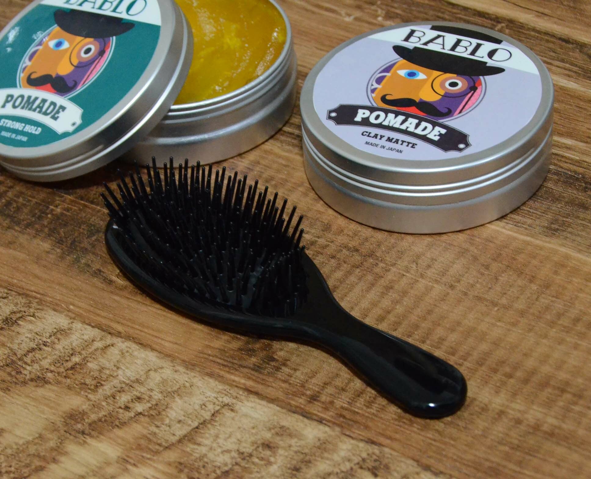日本製ポマードブランド「BABLO POMADE」のヘアブラシ。ブラシヘッド部分は適度な弾力があり、頭皮を心地よく刺激するように設計しました。ポマードやヘアワックスを付ける前のベース作りとして使うのはもちろん、入浴後や就寝前のヘッドマッサージ用アイテムとしてもオススメ!
